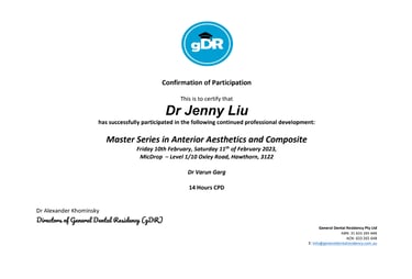 Dr Jenny Liu BDSc(Hons), Dip TMJ & Sleep (UJI), FDSM is a Melbourne-based dentist, clinical educator, and entrepreneur known for her work in preventive and cosmetic dentistry, temporomandibular joint (TMJ) disorders, and the dental management of sleep-related breathing conditions. She graduated with a Bachelor of Dental Science (Honours) from the University of Queensland, completed a Diploma in Temporomandibular Joint Dysfunction and Sleep-Disturbed Breathing at Jaume I University (UJI) in Spain, and holds a Fellowship in Dental Sleep Medicine (FDSM) from the Australasian Sleep Association.